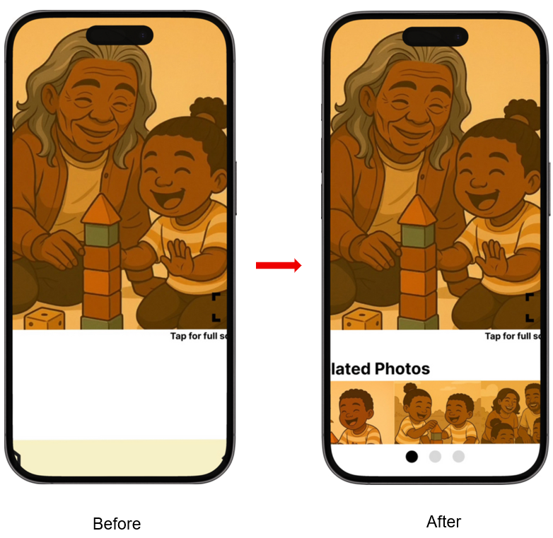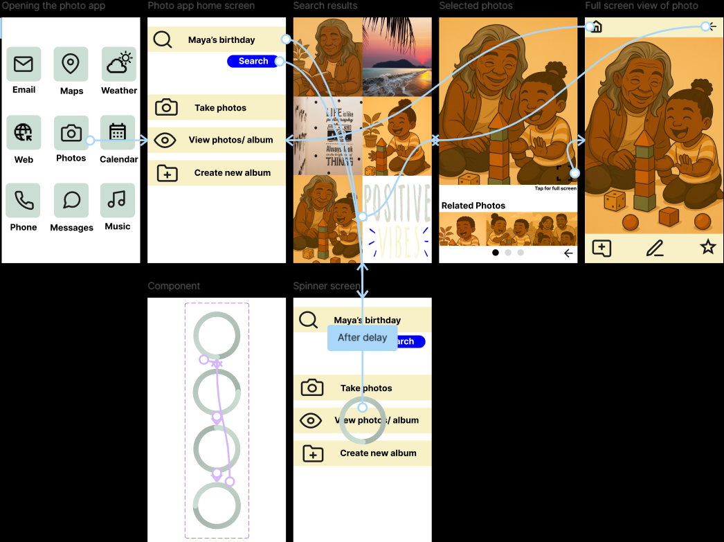 The usability testing provided insightful feedback. The first attempt was unmoderated to get a natural reaction from the participants. The second attempt was moderated with more context, and the participants were then able to understand the problem I was solving for and navigate effectively and intentionally. Overall, the feedback let me know that I was going in the right direction. Liz and Ronnie are much younger than our user persona, Nicole, who is not tech savvy. However, they loved the simplicity this provided. This reminded me of the concept of designing with a specific group in mind, and everyone else benefiting from the design. Valuable feedback came from Ronnie, who is a software developer. Based on his expertise and experience, he was very eager and wanted to fix things in the unmoderated attempt. His experience came from understanding what users prefer in this scenario. He suggested to add a list of related photos to the selected screen results for more options to the user in case they want to explore more photos.