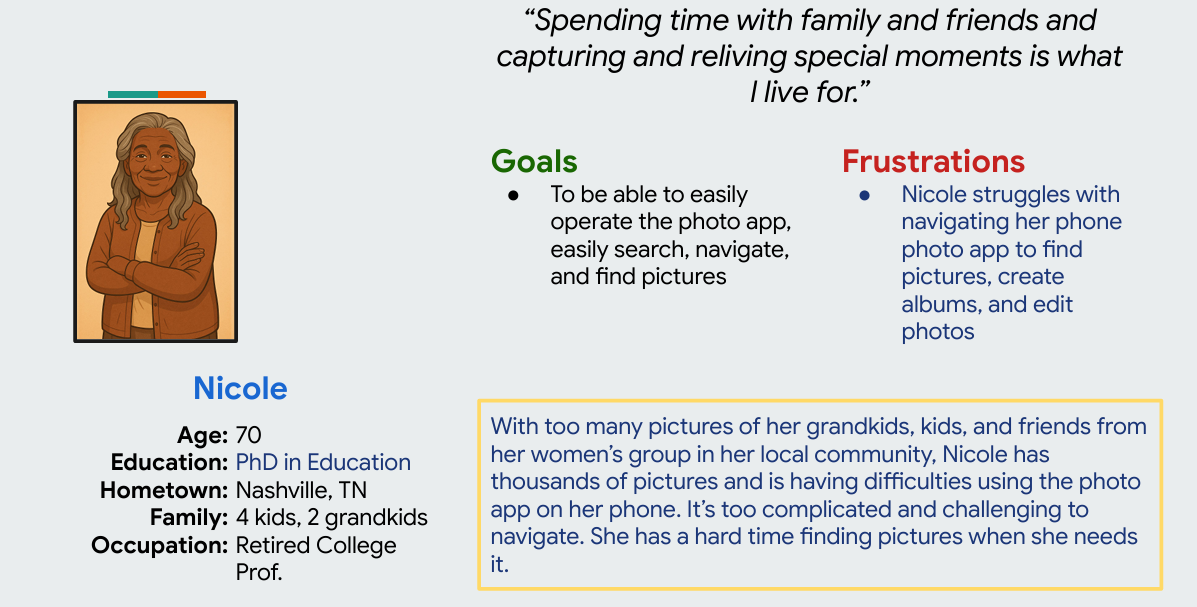 Based on all of the user research feedback on the current photo app, I decided to narrow then my focus on Nicole, as she represented the consensus of what the users said, felt, and thought about the app. Nicole was the primary user persona for the design process.